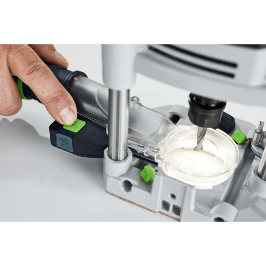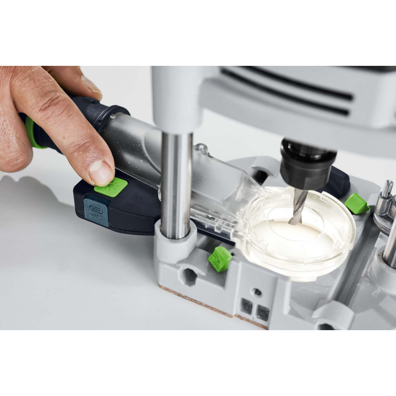 Dzięki osłonie ssącej z zintegrowanym pierścieniem świetlnym LED uzyskiwane jest doświetlenie 360° bez efektu zacienienia, które oferuje dwa poziomy jasności. Jednocześnie odsysanie w obszarze frezowania zapewnia czyste środowisko pracy i optymalną widoczność podczas frezowania. Osłona jest kompatybilna ze wszystkimi modelami OF 1400 i można ją zamontować na stole frezarskim bez użycia narzędzi – co pozwala w mgnieniu oka skonfigurować frezarkę górnowrzecionową. Zintegrowany akumulator pierścienia świetlnego LED oferuje czas świecenia do 6 godzin.